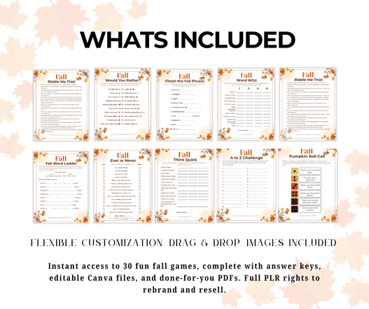 30 Editable Fall Games with PLR Rights | Canva Templates + PDFs + Answer Keys