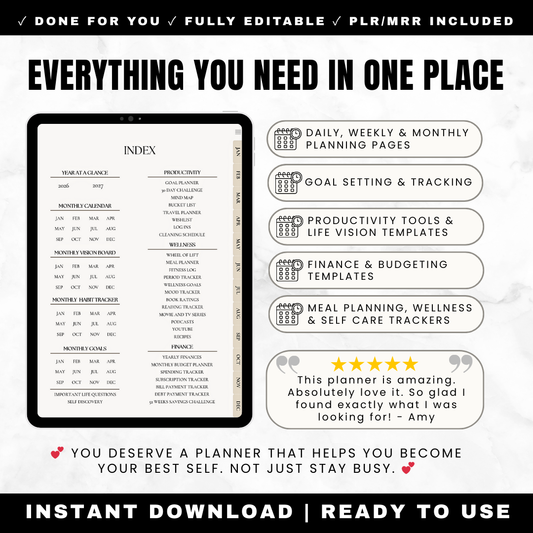 Sell gorgeous planners, trackers, and journals without spending hours creating them from scratch. These printable and editable PLR planners are designed for Etsy sellers, coaches, and creators who want to add high-demand digital products to their store — fast.