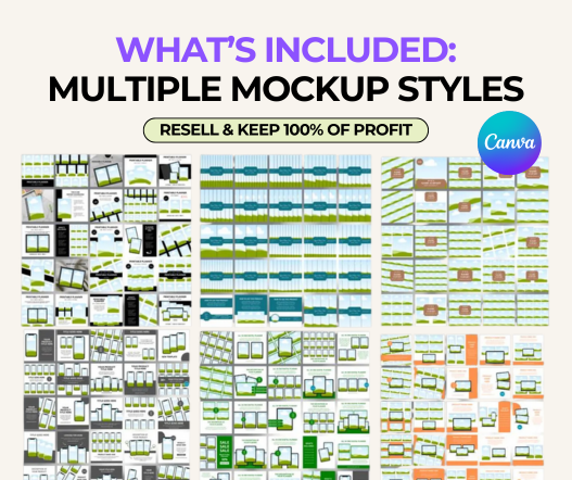 These mockup templates come with PLR & MRR and are perfect to use personally or commercially. They are also fully editable in the free version of Canva. You can change the colours, fonts and design to match your brand.