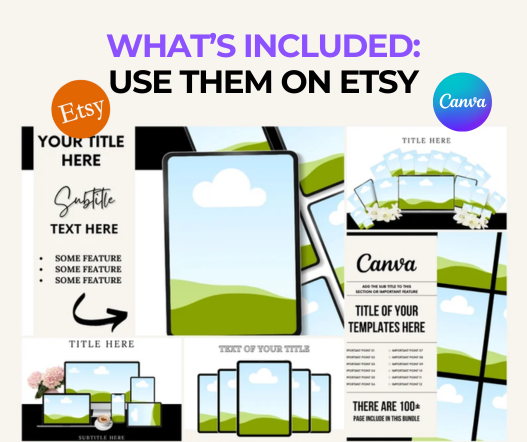 The done for you Etsy listing templates allow you to quickly and easily list your digital products on Etsy. The Canva templates are perfect for beginners or seasoned Etsy sellers and are designed to make creating stunning Etsy Listing images much easier. There are over 110 Etsy listing mockups included in this bundle. They are easy to use, simply drag and drop your images.