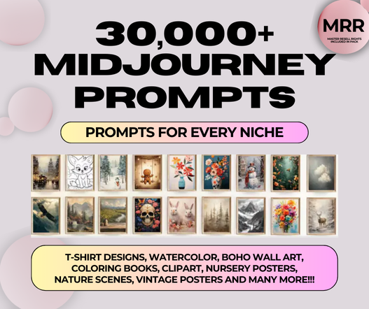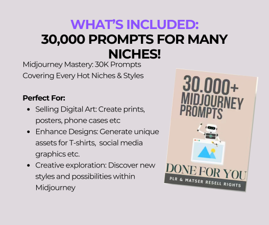 Perfect For Beginner: Unleash Your Creative Power: 30,000+ Midjourney Prompts for Every Hot Niche (Master Resell Rights Included!) Dominate Every Design Trend with This Mega Bundle of Midjourney Prompts!