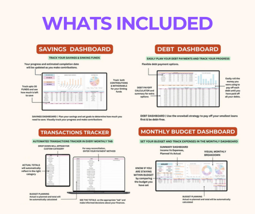 • TRANSACTIONS TRACKER - Built-in transactions tracker in each monthly tab for both income and expenditures.