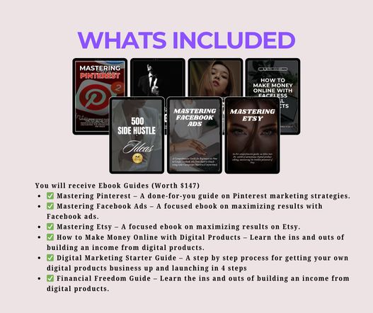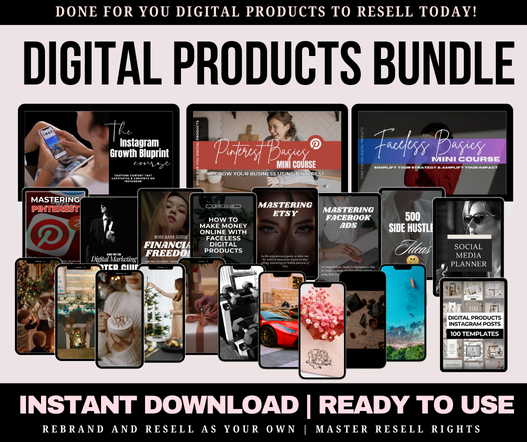 This bundle is perfect for Entrepreneurs, content creators, and marketers ready to scale their digital businesses and take the next steps toward financial freedom. Perfect for beginners and experts alike, this bundle has all you need to kickstart your digital product journey.