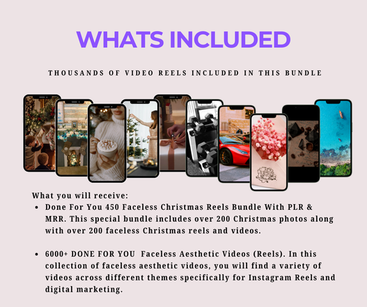 - 450 Faceless Christmas Reels Bundle: Capture the festive spirit with stunning, ready-made reels for Christmas promotions.