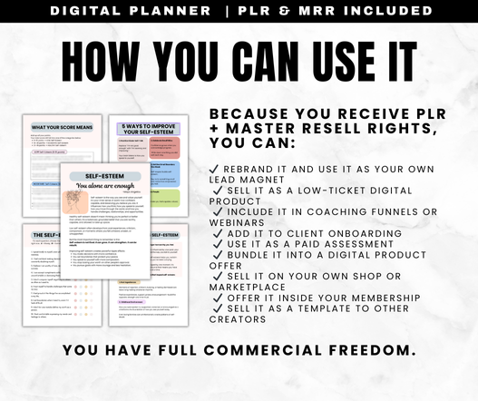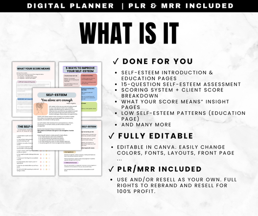 This Self-Esteem Test Lead Magnet Template is a 12-page professionally designed client assessment and building guide that coaches, therapists, counselors, and wellness professionals can rebrand, use with clients, or resell as their own product.