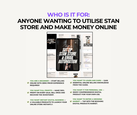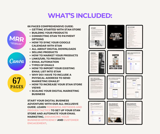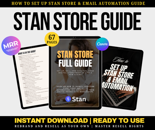 Unlock the potential of your online business with our comprehensive guide on setting up your Stan store and email automation. This digital guide is more than just a manual; it's a complete step-by-step workbook designed to help you seamlessly integrate your e-commerce platform and streamline your email marketing efforts. With private label rights (PLR) and master resell rights (MRR), this guide includes customizable Canva templates to tailor the content to your brand. Whether you're a novice entrepreneur or looking to optimize your existing store, this done-for-you course is the ultimate resource to drive your success. Invest in your business today and start building a thriving online presence with our Stan store and email automation guide.